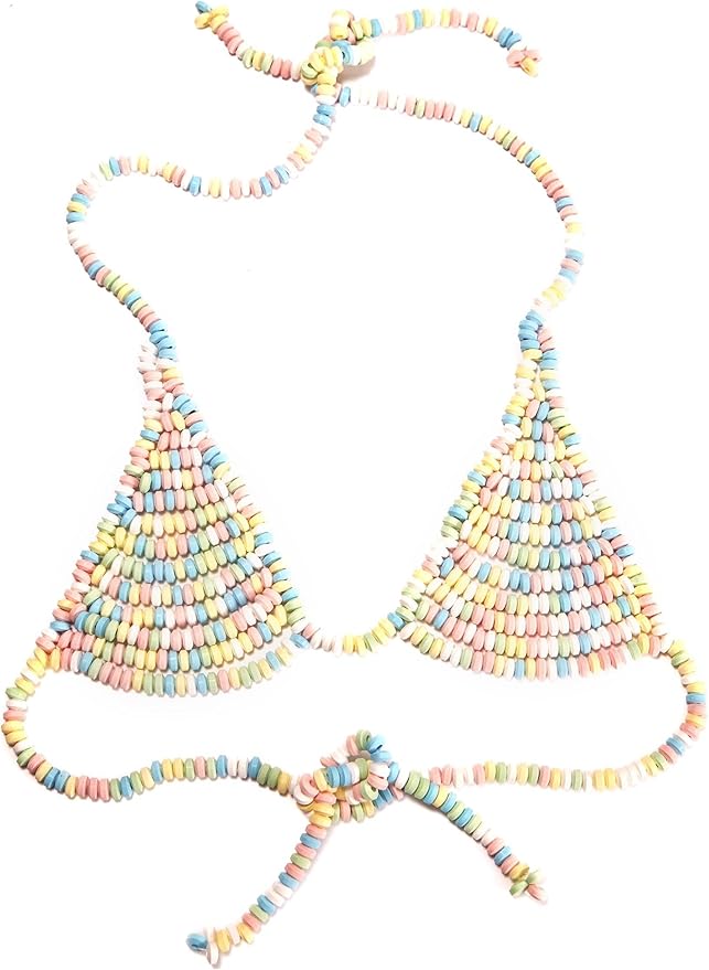 Transition your style from day to night effortlessly with our exclusive eye candy bra collection! The world's best bras, panties, and lingerie. This fun wearable candy bra is the ultimate treat in edible undergarments for the boudoir and features traditional candy necklace beads with elastic strung throughout to create a one size fits most garment or accessory.